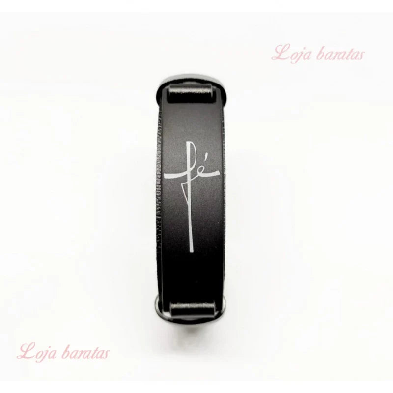 - Design Sofisticado: Couro sintético (ecológico) preto, com fecho cromado de trava e placa em aço com a gravação "Fé".
